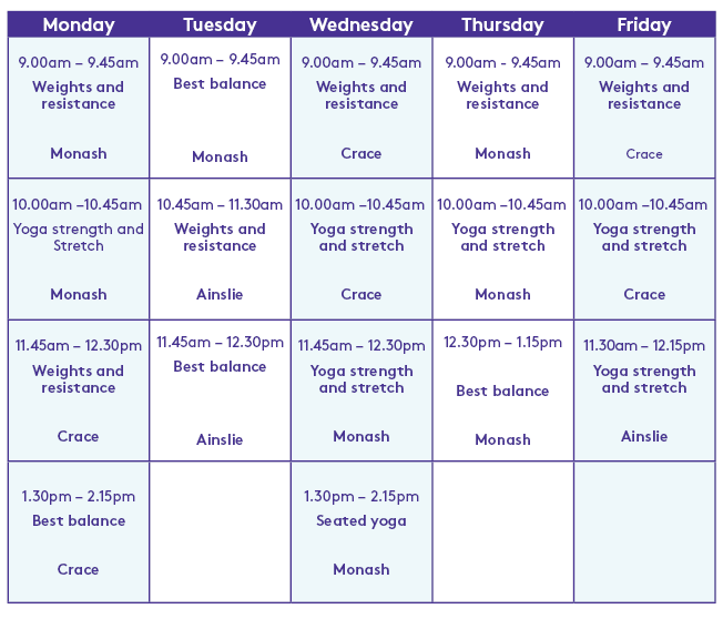 - Access to classes offered at Goodwin Monash, Crace and Ainslie such as Yoga, weights and resistance and balance.
