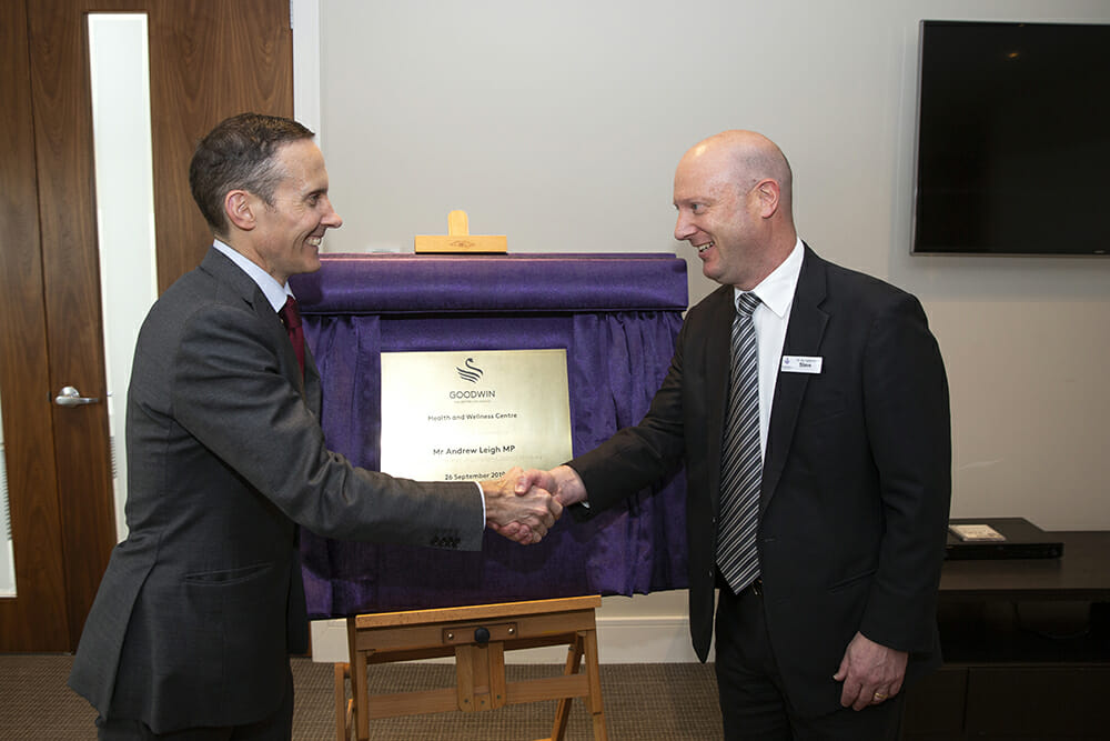 Following the plaque unveiling, Goodwin’s Chief Operating Officer Stephen Holmes gave Dr Leigh a tour of the centre. In the spirit of health and wellness, Dr Leigh took off his suit jacket to try out the fitness equipment. Afternoon tea with the Goodwin community capped off the event.